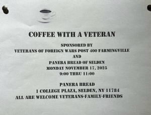 Coffee with a Veteran Location: Panera Bread Of Selden, 1 College Plaza, Selden, Monday, November 17 9am to 11am
